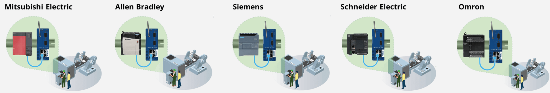Vgrajeni gonilniki modema Ewon Flexy omogočajo zajem TAGov iz registrov PLC krmilnikov različnih proizvajalcev, kar omogoča hitro integracijo opreme. Dodatno programiranje in kode niso potrebne. Povezljivost za Mitsubishi Electric, Siemens, Omron, Allen Bradley, Schneider, Hitachi, ABB, Vipa, ODVA, Modbus, Weintek, Beckhoff, B&R, Crouzet in druge znamke. Ewon Flexy se s pomočjo vgrajenih gonilnikov povezuje neposredno v register PLC krmilnika.